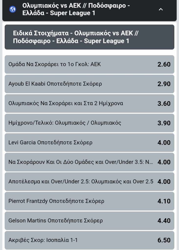 Κόντρα λεπτομερειών στο Φάληρο ανάμεσα στον Ολυμπιακό και την ΑΕΚ. Στις ενισχυμένες αποδόσεις* της Winmasters υπάρχουν αρκετές επιλογές και ενδιαφέροντα πονταρίσματα του συγκεκριμένου παιχνιδιού. Όπως η επιλογή του σκόρερ, ομάδα να σκοράρει το πρώτο γκολ και όχι μόνο. Δεν λείπουν επίσης από την γκάμα της εταιρίας τα υπόλοιπα παιχνίδια της βραδιάς, αλλά και των επόμενων ημερών.