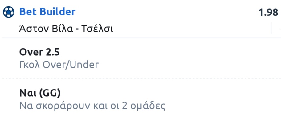 Παρότι δεν υπήρχε σκορ στο πρώτο ματς, Άστον Βίλα και Τσέλσι δεν παύουν να έχουν ποιότητα από το κέντρο και μπροστά. Στο Bet Builder* της Stoiximan μπορούν να συνδυαστούν ορισμένες επιλογές για παραπάνω απόδοση στο παιχνίδι μας. Το ματς μπορεί να συνοδευτεί με τέρματα και αξίζει το Goal/Goal & Over 2.5 σε απόδοση 1.98 στην Stoiximan.